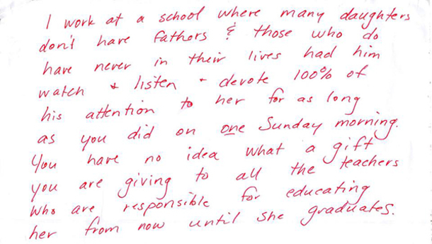 Please don’t wait for your child or other loved one to plead for your attention like mine did — he or she might not. Expect that no one will leave a note for you — such beauty in this world is far too rare. I invite you to share the gift of this experience with me: choose to be present today — even for just a little while — for someone you love. If you see it happen somewhere, consider leaving a note — it sure does leave an impression.