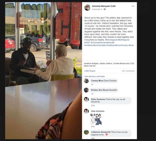 She continued: “Shout out to this guy! My friends and I watched him introduce himself and shake her hand. They talked and laughed together like they were friends. They didn’t know each other, and they couldn’t be more different. But, today, they shared a meal together and it touched our hearts.”